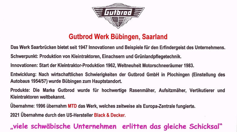 1954 endete die volumenmäßig zu kleine Autoproduktion, obwohl man 1952 mit dem Gutbrod Superior 700 E eines der ersten Serienfahrzeuge mit Benzindirekteinspritzung auf den Markt gebracht hatte. Die Fertigung von Garten- und Landwirtschaftsgeräten wurde 1957 nach Bübingen bei Saarbrücken verlegt, wo Gutbrod 1970 weltweit größter Hersteller von Kleintraktoren und Rasenmähern wurde. Gutbrod verleugnete seine bäuerliche Herkunft nie. Neben Motorrädern und Automobilen widmete er sich daher auch der Entwicklung von Geräten, die Hobbygärtnern wie auch Großbauern die Arbeit erleichtern sollten.